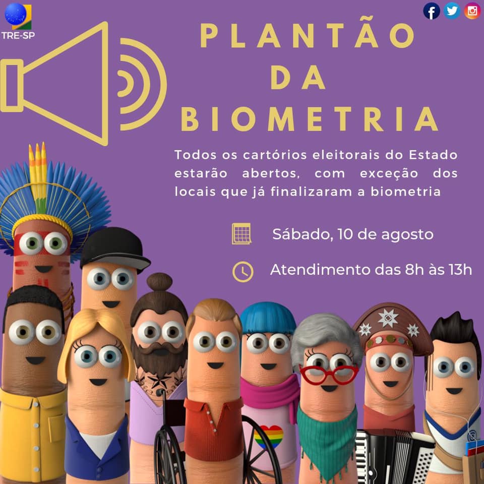 Está chegando o plantão da biometria! Sábado, dia 10, todos os cartórios eleitorais do Estado de São Paulo estarão abertos, das 8h às 13h – exceto nos locais onde o procedimento já foi concluído.